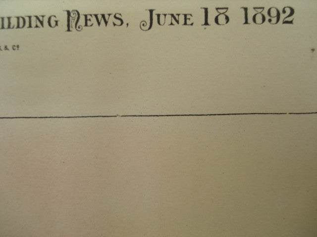 J. M. Van Osdel & Co., architect(s). From the American Architect and Building News, July 18, 1892. 12.5 by 8.75 inches. VG+ condition with light browning along the edges .
