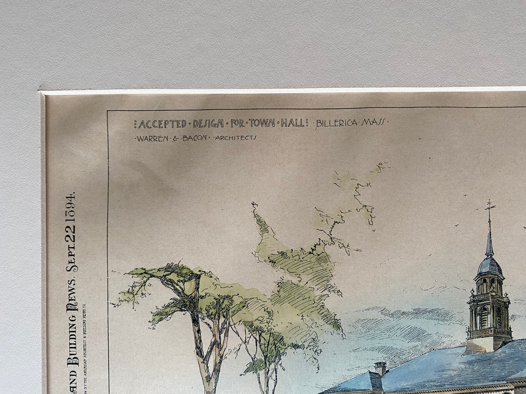 A Beautifully Detailed, Original Plan of the Accepted Design for the Billerica Town Hall, Billerica, Massachusetts. HAND COLORED Warren & Bacon, Architect(s). From the American Architect and Building News, September 22, 1894.
