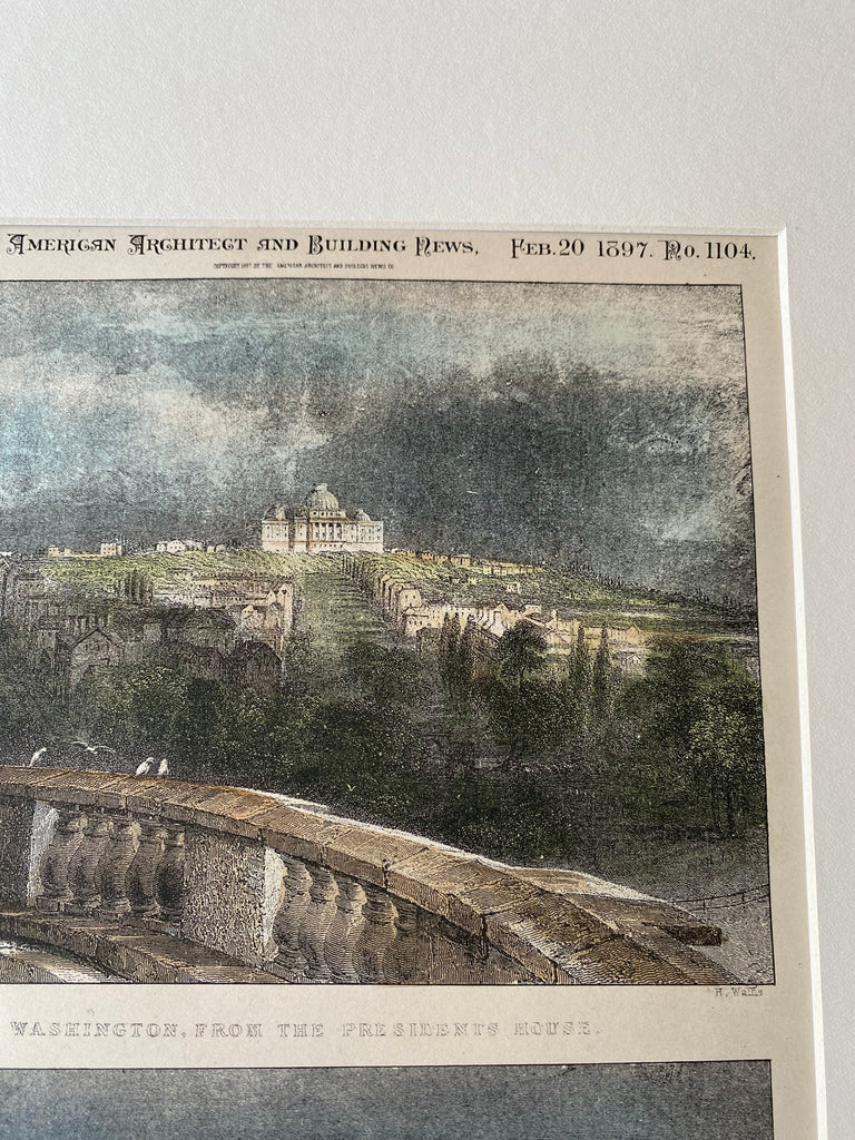 A Beautifully Detailed, Original Plan of the US Capitol, Washington DC, Views from the street and the President's House. Hand Colored From the American Architect and Building News, February 20, 1897.